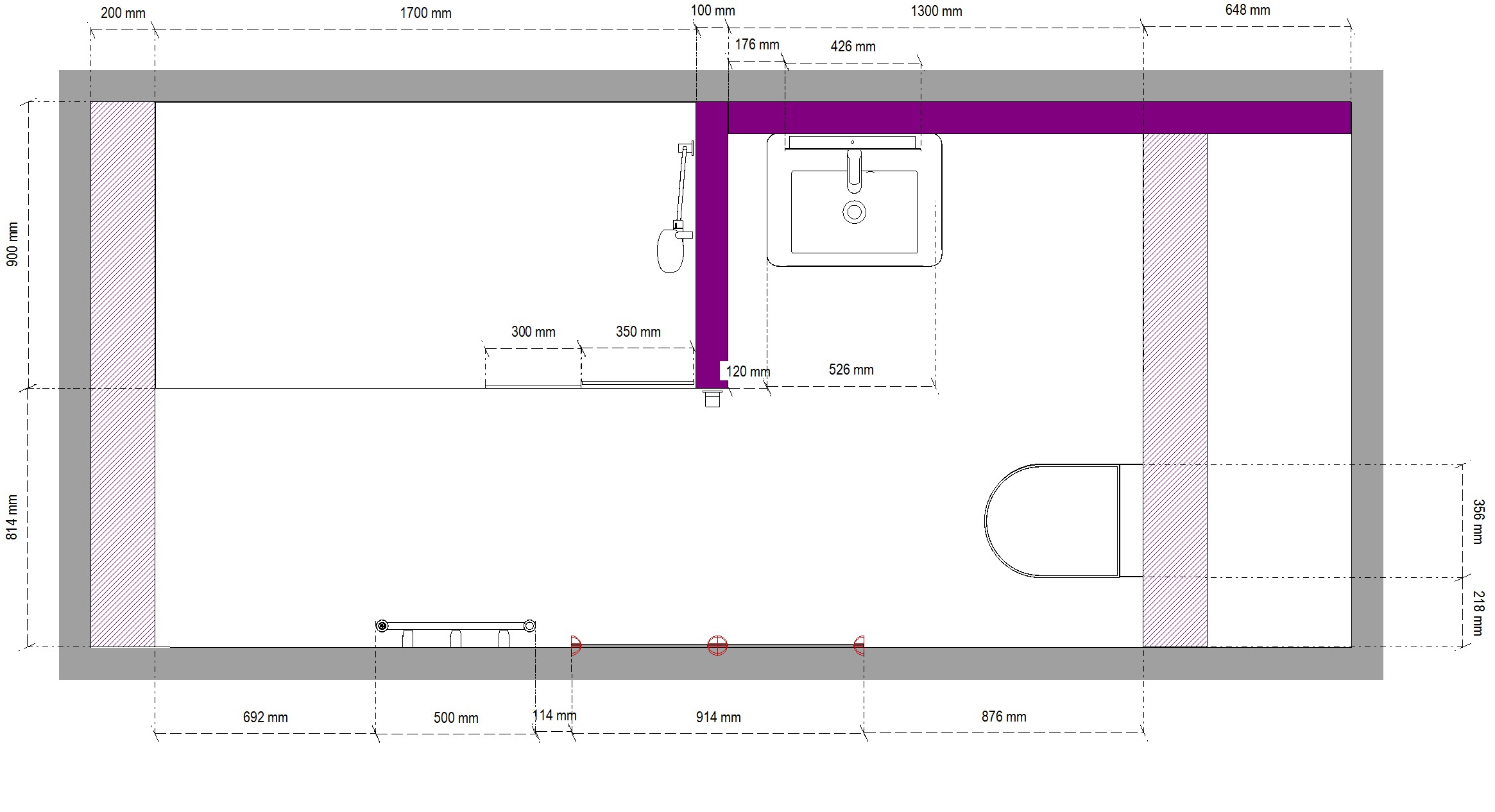 To ensure a visually pleasing effect we were able to use studwork along the outer wall as well as through the middle of the room. The stud work highlighted in purple (see plan to the right) was positioned to give the shower area the highest point of the room. This allowed for the running of the waste pipes and feeds to achieve a clean finish. We were also able to include a full length shower tray and a bespoke screen for splash protection.