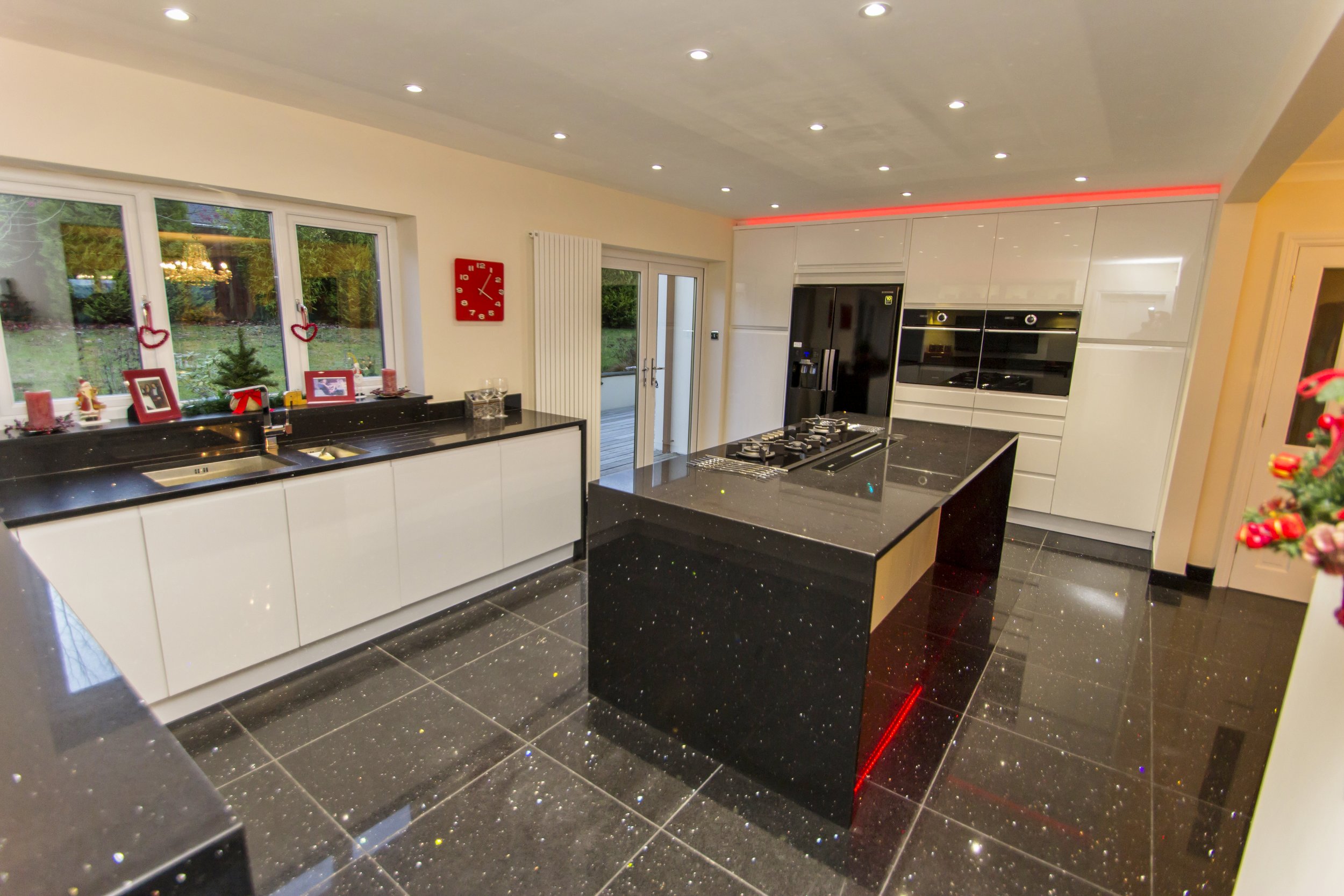 Removing the dividing wall was key to creating a feeling of space and light. Blocking up the door into the kitchen allowed us to house a bank of units for appliances. The main door became a double door that gave access off a spacious hallway. The island with downdraft extraction maintains the feeling of space gives space for the creative chef and also additional seating at the a breakfast bar – ideal for entertaining too!! . Large Drawers, minimalist handle-less doors and a sparkling quartz floor and coordinating work surface set the room off. We integrated coloured lighting so that the customer could have the her favourite red theme but the lights had a colour change option to suit different moods and occasions at different times of the year.